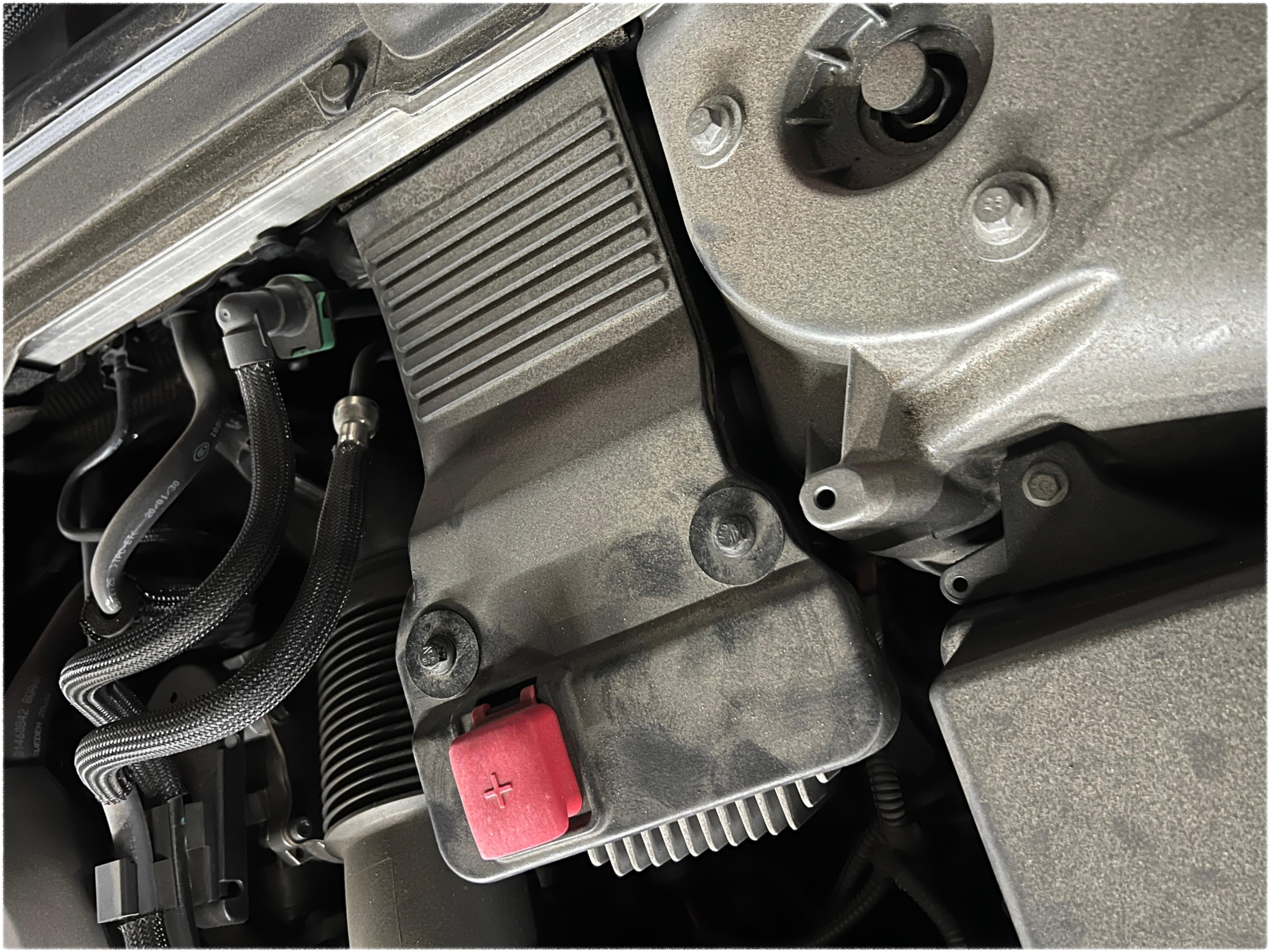 본넷을 열면 우측 상단, 빨간색 “+” 표시가 있는 부분이 보입니다.